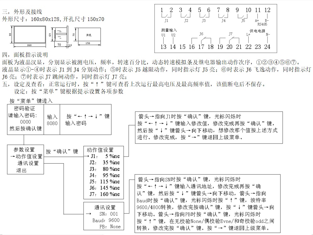 5,繼電器輸出動(dòng)作值設(shè)定:裝置共有7組繼電器動(dòng)作報(bào)警及控制輸出,可分別設(shè)定動(dòng)作值。