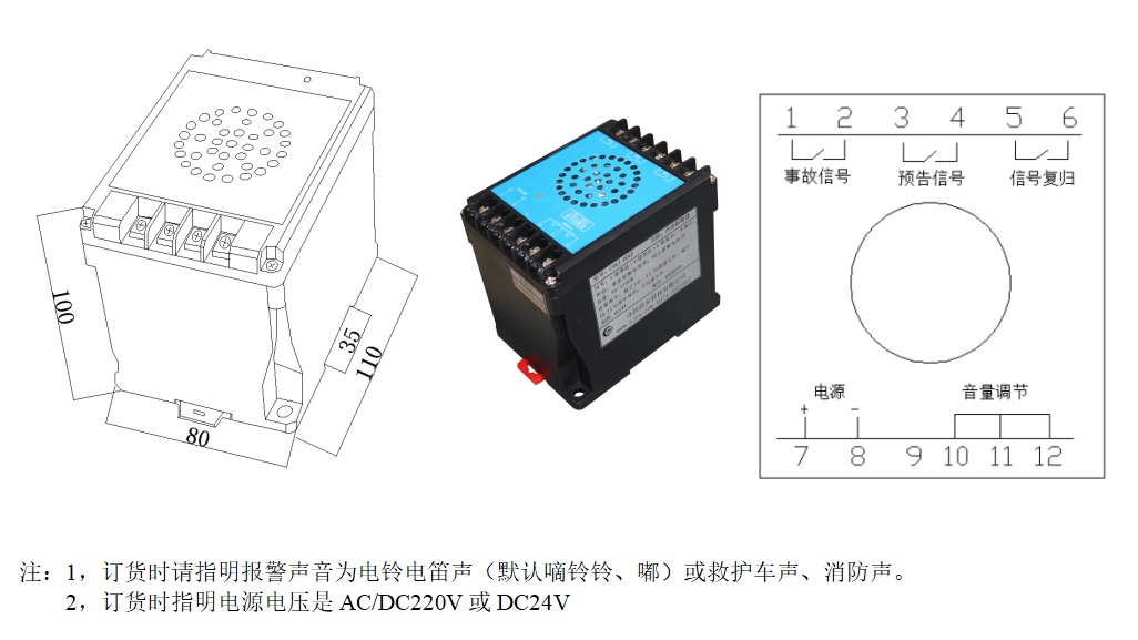 音量調(diào)節(jié):報(bào)警器默認(rèn)低音量,端子10-11-12三個端子為音量調(diào)節(jié)端子,10-11短接中音量,10-12短接高音量,不短接為低音量。