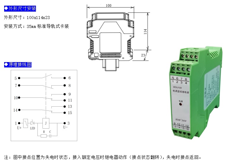 DCVJ電源監(jiān)視繼電器,適用于直流系統(tǒng)電源失電監(jiān)視,當電源電壓正常時繼電器動作,同時LED電源指示燈亮起,當電源電壓低于30V或電源消失,繼電器將延時0.5s后返回,同時LED指示燈熄滅。
